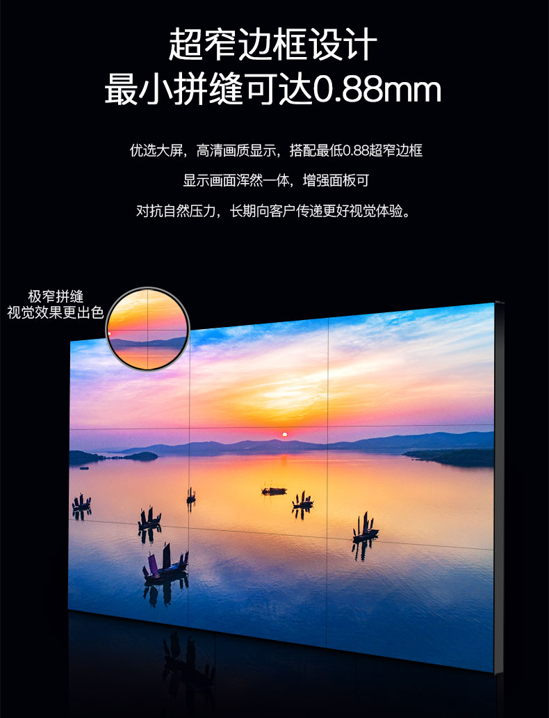 1、拼縫:由于液晶拼接屏是由多塊拼接屏面板所組成的。所以在各個面板之間會存在著一定的拼接縫隙。拼接縫隙當然是越小越好。拼接縫隙如果太大了的話,則會影響視覺效果。